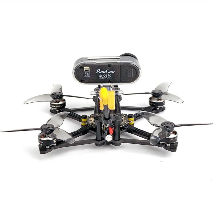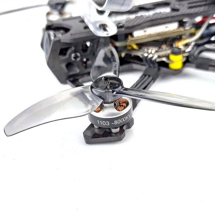 Le moteur sans balais 1103 8 000 KV ne pèse que 3,7 g. Malgré sa petite taille, il délivre une puissance et une poussée impressionnantes, permettant jusqu'à 5 minutes de vol. Remarque : le moteur ne prend en charge que les batteries 2S. Le connecter à des batteries 3S et appuyer trop sur l'accélérateur peut causer des dommages permanents.