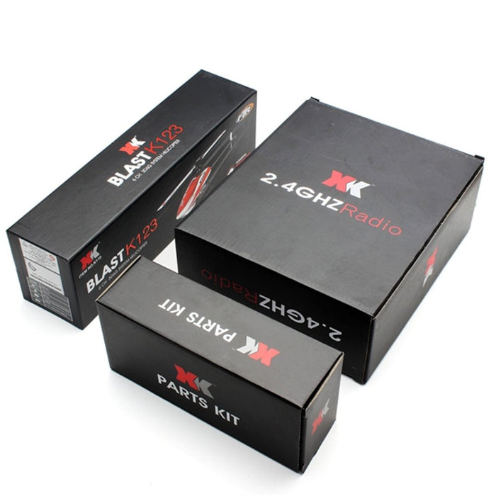 Kies uit twee pakketopties: de Ready-to-Fly (RTF) of Bind-and-Fly (BNF) bundels. Beide sets bevatten een K123 RC-helikopter, hoofd- en staartbladen, hoofduitrusting, USB-oplader, Li-po-batterij, schroevendraaier en inbussleutel. Voor uw gemak bevat het RTF-pakket ook een zender.
